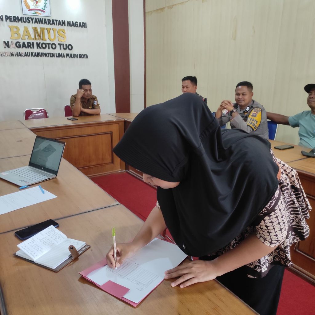 TBNEWSSUMBAR.ID. Lima Puluh Kota – Bhabinkamtibmas Nagari Koto Tuo Brigpol Fajar Wigi Ferdana menghadiri kegiatan mendengar keterangan saksi saksi terkait adanya surat yang masuk ke Wali Nagari tentang kinerja Kepala Jorong Padang Rantang di Aula Bamus Nagari Koto Tuo, Kecamatan Harau, Kabupaten Lima Puluh Kota, Senin (24/03/2025).