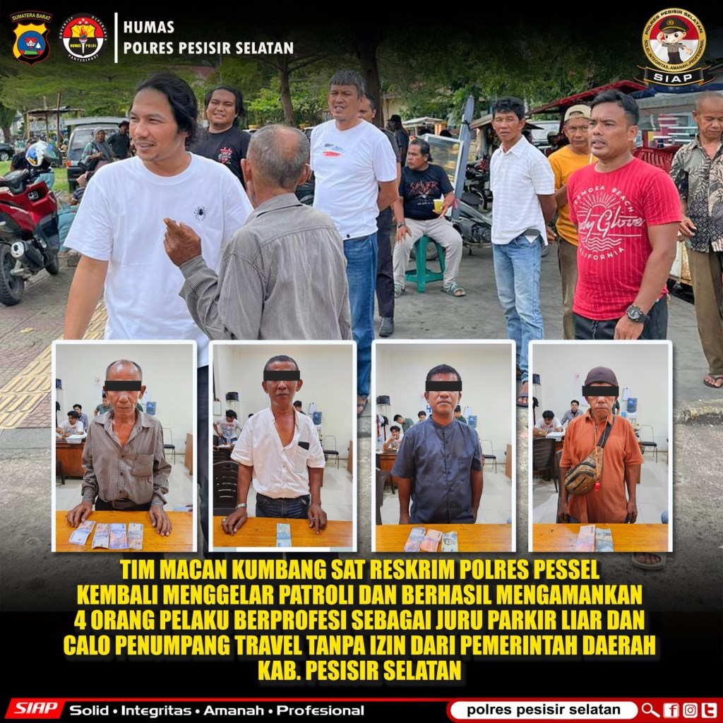 Diantaranya keempat diduga pelaku berprofesi sebagai juru parkir liar dan calo penumpang travel tanpa izin dari pemerintah daerah Kabupaten Pesisir Selatan.