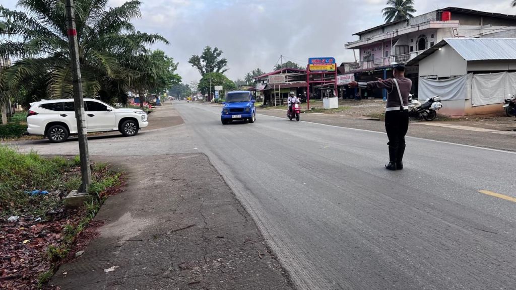 TBNEWSSUMBAR.ID — Personel Satlantas Polres Dharmasraya, Aiptu Erizal, melakukan pengaturan lalu lintas di Simpang SD IT, Jalan Lintas Kampung Baru, Nagari Sikabau, Kecamatan Pulau Punjung, Kabupaten Dharmasraya, pada Senin pagi (19/05/2025).