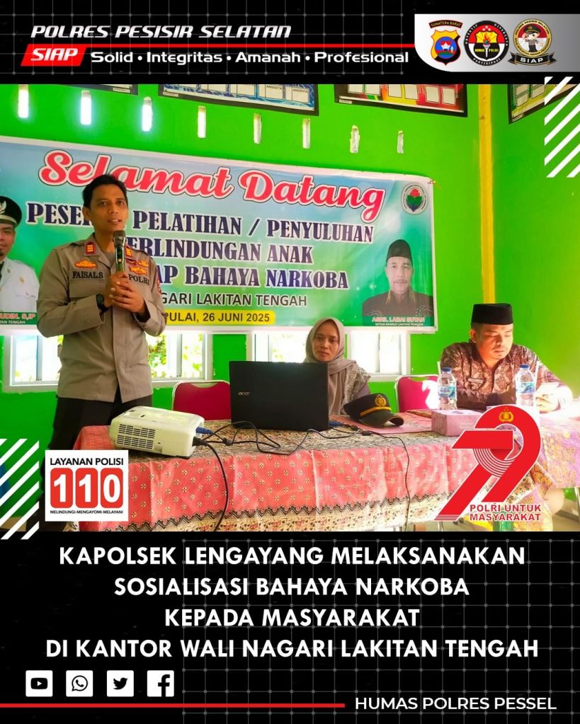 TBNEWSSUMBAR.ID |  Pesisir Selatan — Dalam rangka upaya preventif pemberantasan penyalahgunaan narkoba di kalangan generasi muda, Kapolsek Lengayang AKP Faisal Safutra, S.H., M.H. melaksanakan kegiatan sosialisasi bahaya narkoba dalam acara pelatihan dan penyuluhan perlindungan anak yang digelar di Aula Kantor Wali Nagari Lakitan Tengah, Kecamatan Lengayang, pada Kamis, 26 Juni 2025 pukul 09.00 WIB.