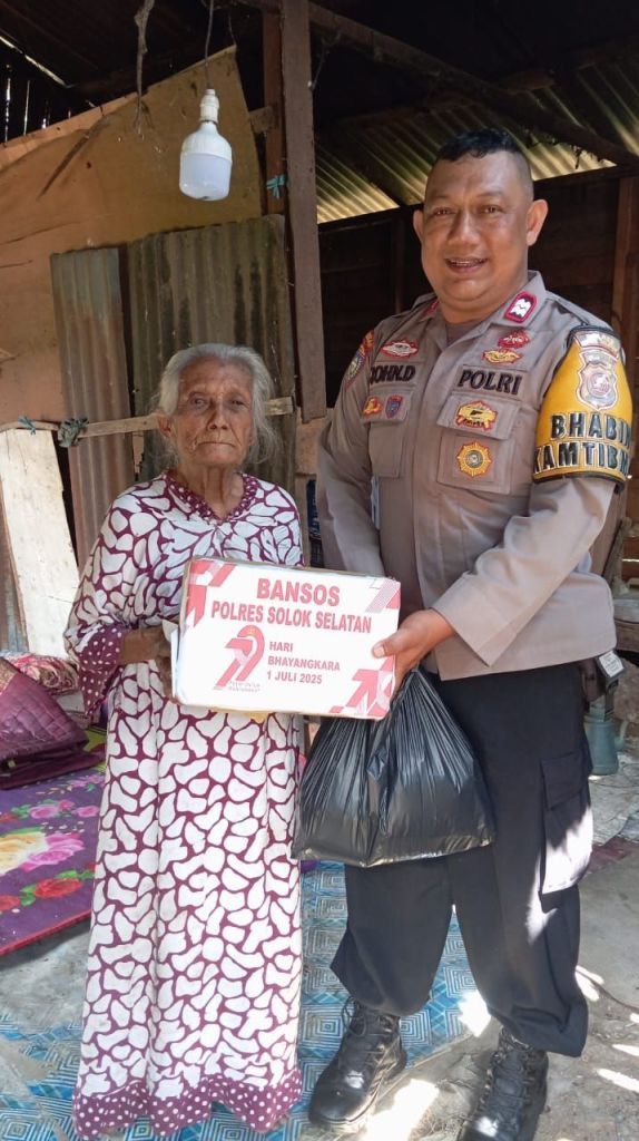 TBNEWSSUMBAR.ID | Dalam rangka merayakan Hari Bhayangkara ke-79, Bhabinkamtibmas Aiptu John Davidson menampilkan wujud nyata kepedulian Polri terhadap masyarakat dengan memberikan bantuan sosial kepada Rosmaniar (83), seorang warga Jorong Sapan Ampalu, Nagari Pauh Duo, Kabupaten Solok Selatan.