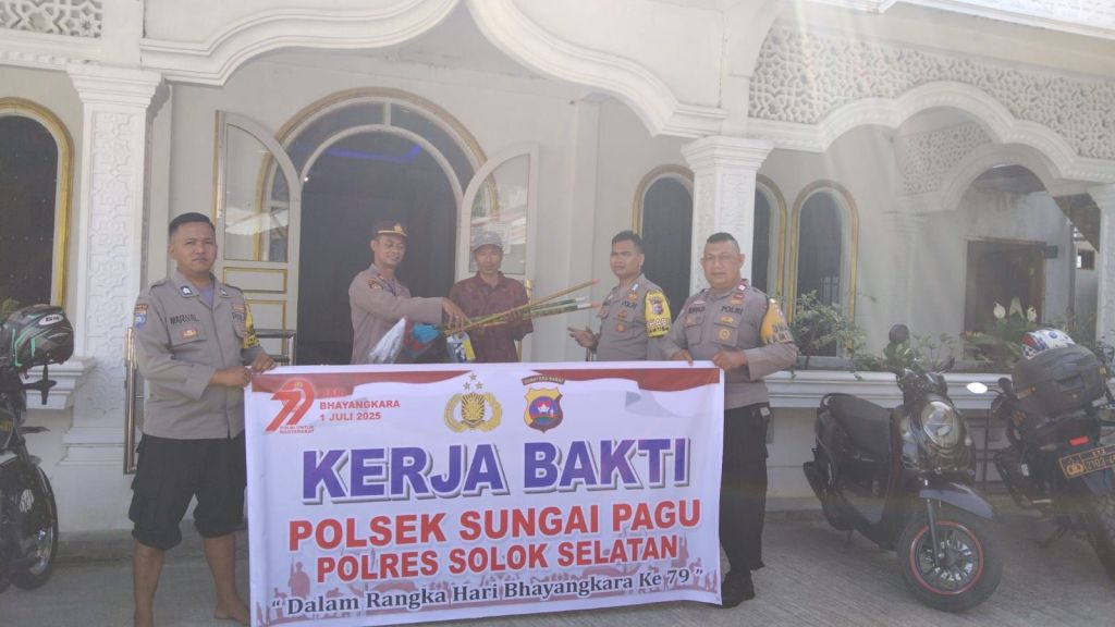 TBNEWSSUMBAR.ID | Dalam rangka memeriahkan Hari Bhayangkara ke-79, Polsek Sungai Pagu Polres Solok Selatan menunjukkan bukti pengabdian yang menggetarkan jiwa. Dipimpin langsung oleh Kapolsek IPTU Azwar Zamzami, personil polsek tak ragu turun tangan membersihkan Mesjid Nurul Iman, Kampung Tarandam, Kecamatan Sungai Pagu.