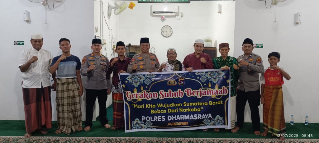 TBNEWSSUMBAR.ID — Personel Polres Dharmasraya melaksanakan Gerakan Sholat Subuh Berjamaah (GSB) bersama warga di Masjid Ar Rahman, Jorong Padang Candi, Kecamatan Pulau Punjung, Kabupaten Dharmasraya, pada Sabtu (12/7/2025) sekitar pukul 05.00 WIB.
