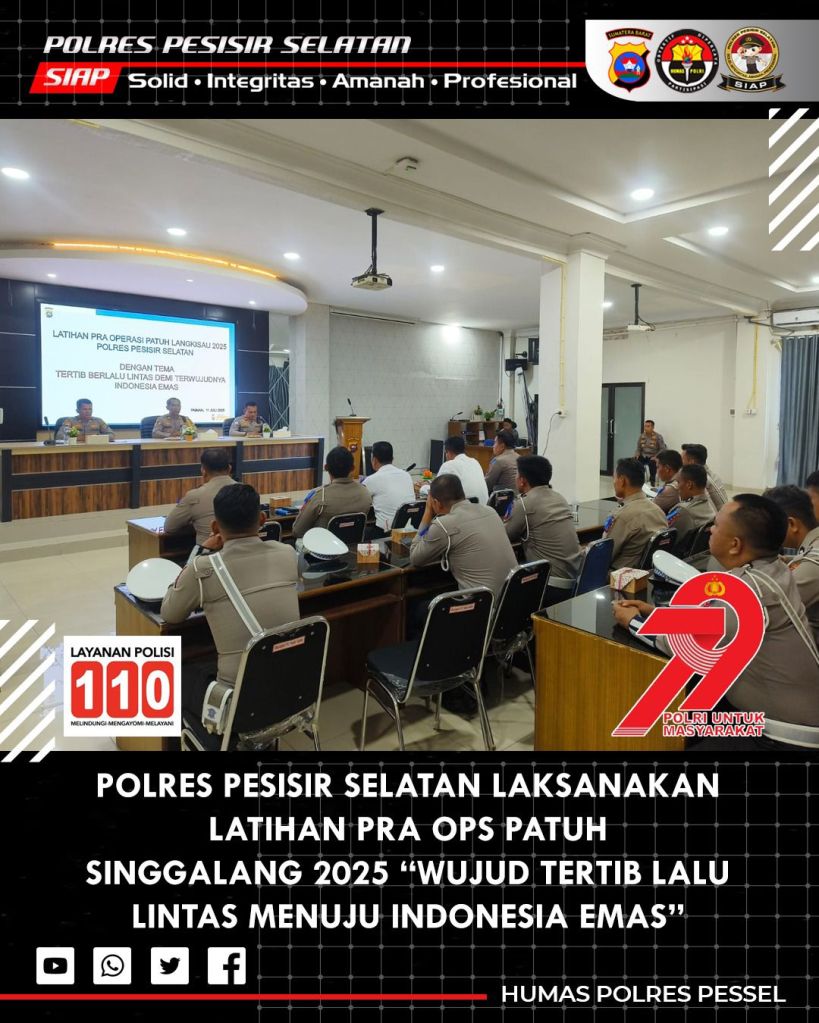 TBNEWSUMBAR.ID – Polres Pesisir Selatan melaksanakan Latihan Pra Operasi (Lat Pra Ops) Patuh Langkisau 2025 sebagai persiapan menyukseskan operasi kepolisian terpusat ini. Kegiatan Lat Pra Ops ini digelar pada Senin, 14 Juli 2025, sekitar pukul 09.15 WIB, bertempat di Aula Endra Dharmalaksana Polres Pesisir Selatan.