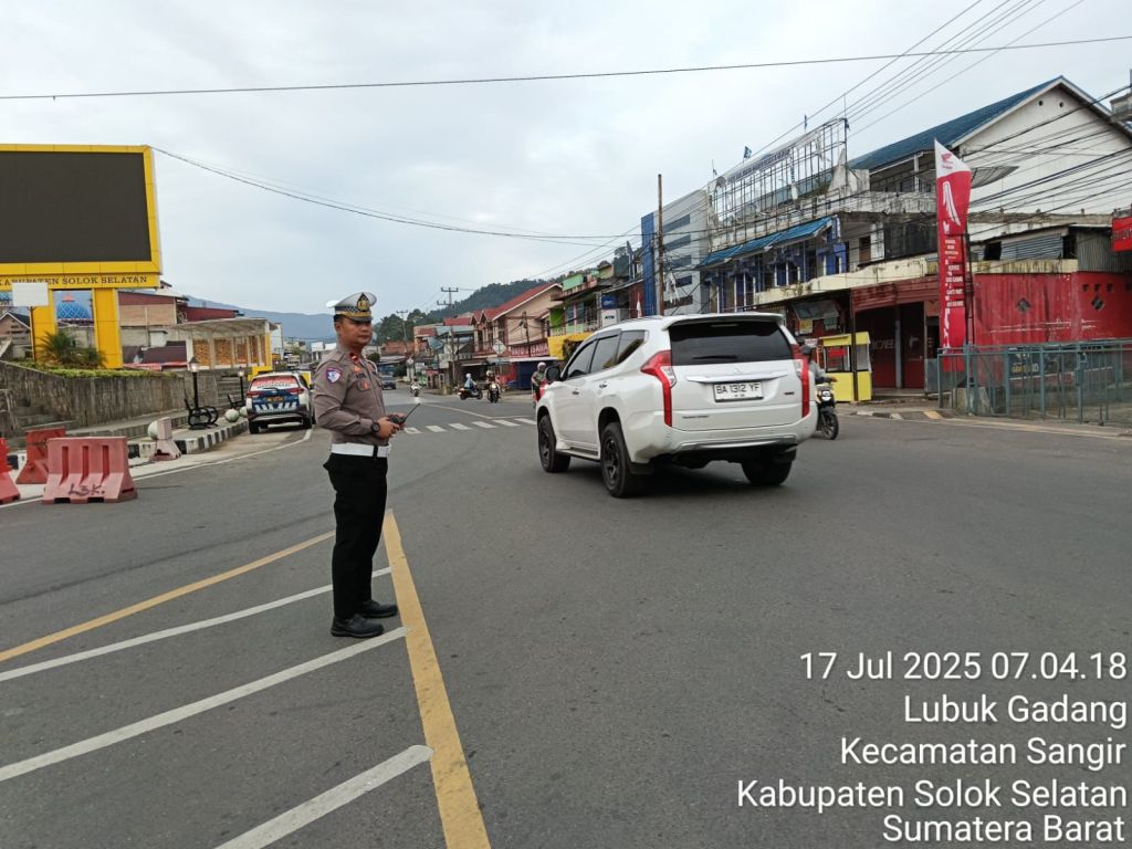 TBNEWSSUMBAR.ID – Setiap pagi di persimpangan jalan yang padat di wilayah Padang Aro, Kabupaten Solok Selatan, pemandangan berbeda terlihat. Di antara hiruk pikuk kendaraan dan langkah kaki masyarakat yang hendak memulai aktivitas, berdiri tegap personel Polisi Lalu Lintas dari Polres Solok Selatan yang berjaga dan mengatur arus lalu lintas.