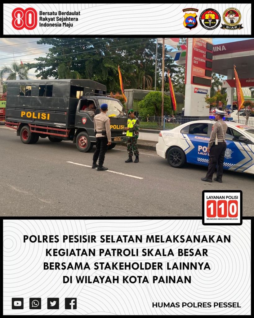 TBNews Sumbar. Pesisir Selatan – Guna meningkatkan rasa aman di tengah masyarakat, tim gabungan dari TNI, Polri, dan Satpol PP menggelar patroli skala besar di dua wilayah strategis. Kegiatan yang dipimpin oleh Kabag Ops AKP Teguh Priyatno, S.H., ini dilaksanakan pada Senin, 1 September 2025, pukul 17.00 WIB.
