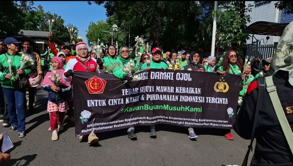 Dalam aksi bertajuk “Aksi Ojol Tebar Sejuta Mawar Kebaikan Aparat TNI, Polri, dan Masyarakat”, mereka membawa bunga mawar sebagai simbol perdamaian.