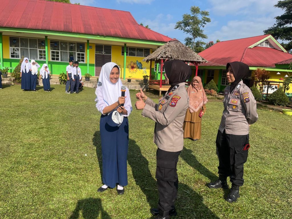 Aipda Risa Afriani, salah satu Polwan yang hadir, turut memberikan motivasi agar para siswa selalu semangat belajar, berdisiplin, serta menghormati guru sebagai kunci dalam meraih cita-cita.
