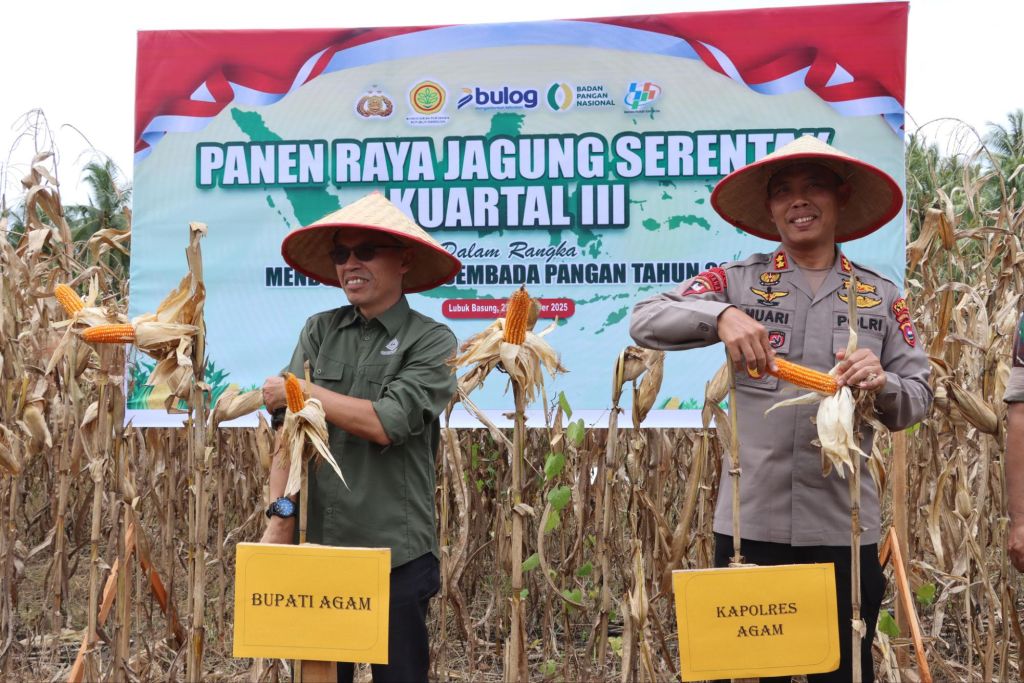 TBNews Sumbar — Sebagai bagian dari upaya mendukung ketahanan pangan nasional, Wakapolres Sijunjung, KOMPOL DENY AH, SIK bersama dengan Forum Koordinasi Pimpinan Daerah (Forkopimda) setempat melakukan kegiatan panen jagung serentak Kuartal III di lahan pertanian milik warga di kawasan Nagari Padang Sibusuk, Kecamatan Kupitan, pada Sabtu (27/9/2025).