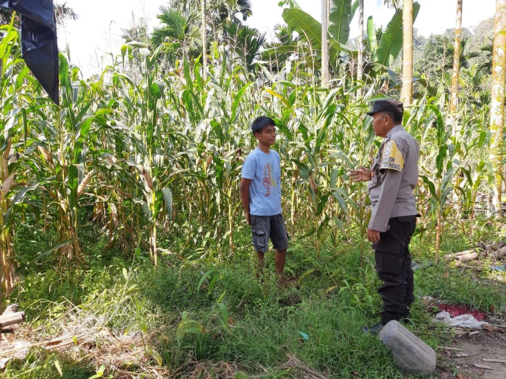 Senin (3/11/2025), Bhabinkamtibmas meninjau lahan jagung milik Eman di Jorong Padang Laweh, Nagari Ganggo Hilia, Kecamatan Bonjol, Kabupaten Pasaman.
