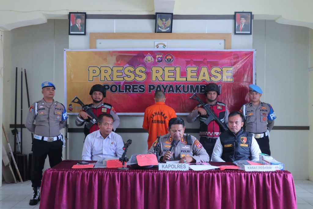 Penetapan tersangka ini disampaikan secara langsung oleh Kapolres Payakumbuh AKBP Ricky Ricardo, S.I.K.S.H.M.H didampangi oleh Kasat Reskrim IPTU Andrio P Siregar, S.H.M.H pada moment Press Release yang di laksanakan di Aula Polres Payakumbuh, Senin (08/12) pagi sekira pukul 10.00 Wib.