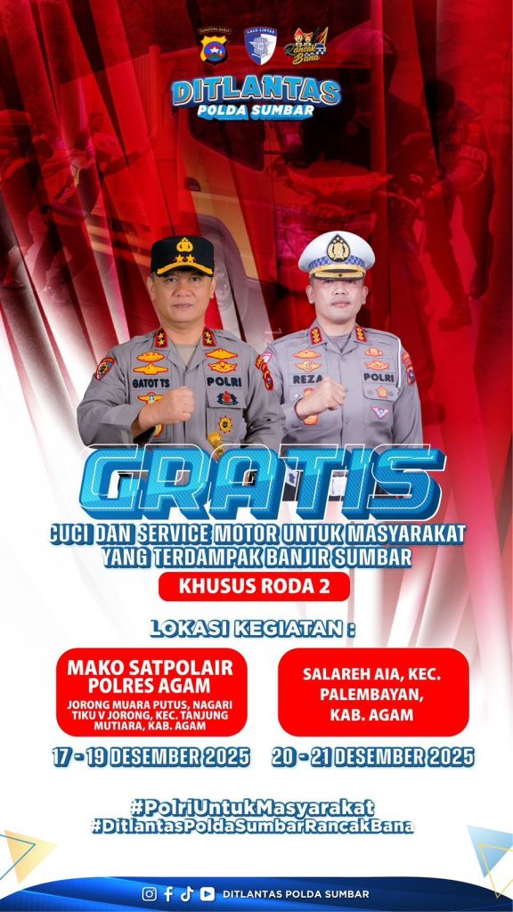 Polda Sumbar mengajak masyarakat yang kendaraannya terdampak banjir untuk memanfaatkan layanan ini secara gratis sesuai jadwal dan lokasi yang telah ditentukan. Kegiatan ini diharapkan menjadi bentuk solidaritas dan kepedulian Polri kepada masyarakat Sumatera Barat yang tengah bangkit dari bencana.