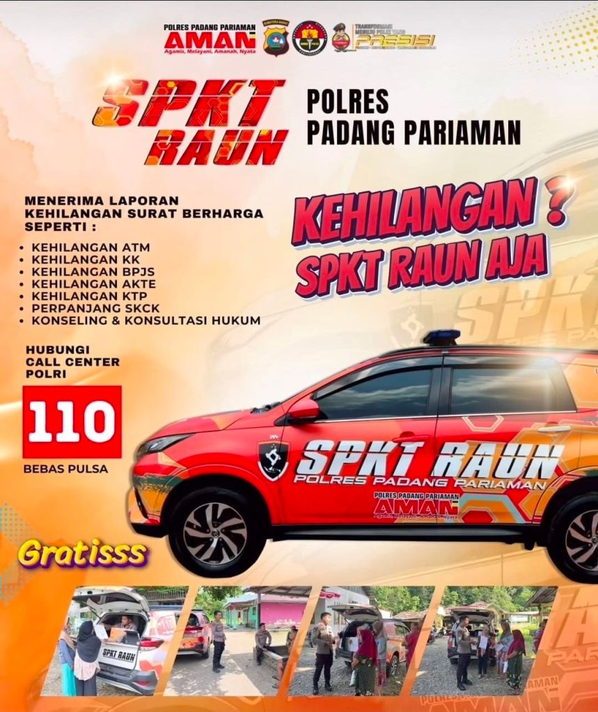 TBNews Sumbar – Polres Padang Pariaman meluncurkan inovasi pelayanan publik bernama “SPKT Raun” berupa mobil layanan keliling yang berfungsi sebagai kantor polisi berjalan. Program ini dirancang untuk mendekatkan pelayanan kepolisian kepada masyarakat, terutama warga di nagari-nagari terpencil yang selama ini kesulitan mengakses kantor polres karena jarak jauh.