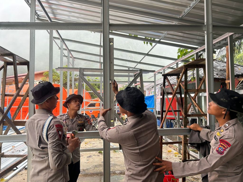 Sejumlah personel Brimob yang dipimpin Ipda Yondril fokus pada perakitan rangka baja ringan sebagai bagian dari proses pembangunan huntara.