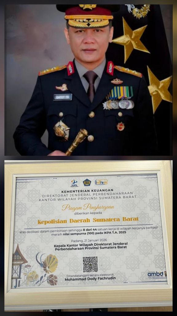 TBNews Sumbar – Kepolisian Daerah Sumatera Barat (Polda Sumbar) resmi menerima penghargaan dari Kementerian Keuangan Republik Indonesia atas capaian kinerja pengelolaan anggaran tahun 2025 yang dinilai optimal, akuntabel, dan berintegritas.