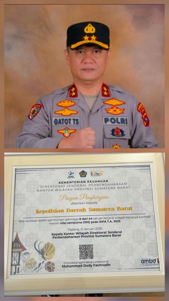 TBNews Sumbar – Kepolisian Daerah Sumatera Barat (Polda Sumbar) kembali menorehkan prestasi gemilang dalam pengelolaan keuangan negara. Atas dedikasi tinggi dalam pembinaan satuan kerja, Polda Sumbar menerima penghargaan bergengsi dari Kantor Wilayah Direktorat Jenderal Perbendaharaan (DJPb) Provinsi Sumatera Barat, Selasa (27/1/2026).